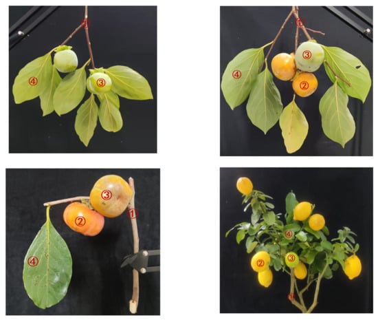 To evaluate and verify the performance of the classification method in the next section, we acquired spatial–spectral point cloud data of tree samples from our HSL. The tree samples include two species: persimmon (Diospyros kaki Thunb.) and lemon (Citrus limon (L.) Burm. F.). The persimmon samples we used for the study included six branches with unripe fruit and six branches with both ripe and unripe fruit. All fresh branches were sawn off from persimmon trees in the South Campus of Anhui JianZhu University in October 2021 and July, August, and September 2022. In addition, we selected three lemon trees (bonsai trees), which were used to simulate tree samples for an orchard, to explore the generalizability of our method to other fruit tree species. For persimmon samples, the spectral characteristics of unripe and mid-ripe fruits are similar, while the spectral characteristics of ripe and over-ripe fruits are similar [29]. Therefore, this study defines two ripeness levels (ripe and unripe) to characterize fruit ripeness. The lemon samples were from trees at the mid-ripening stage with unripe and ripe fruit. As illustrated in Figure 2, the order numbers ①, ②, ③, and ④ correspond to the components of the wood, ripe fruit, unripe fruit, and leaves, respectively. All samples were hung vertically on a metal stand at 10 cm from the black cloth behind the sample.