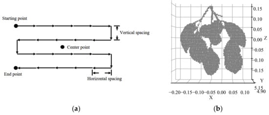 HSL scanning strategy and persimmon tree scan points. (a) The zigzag scanning pattern of HSL; (b) preprocessed HSL point cloud of the persimmon tree.