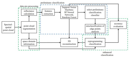 The data preprocessing part consists of point cloud segmentation and spectral reflectance calculation, which was discussed in Section 2.3. The preliminary classification includes feature parameter extraction (refer to the analysis in Section 3.1 for details), multiple classifications, and misclassification of edge points analysis. In order to reduce the misclassification of edge points, enhanced classification was conducted based on the spatial constraint relationship of the HSL point cloud. Finally, the 3D reconstruction of the classification results was completed by fusing the spatial coordinates.