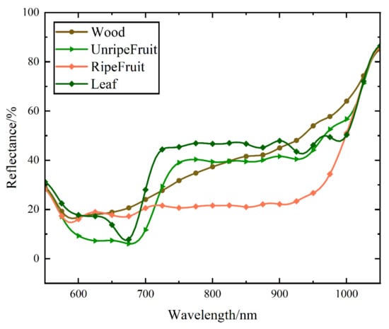 In order to analyze the reflection properties of the persimmon tree samples across different wavelengths, we plotted the average reflectance distribution curves for each of the four components in Figure 5. The reflectance variation tendencies of the four components are considerably different, as observed. The reflectance of the wood increases with the wavelength. The leaf reflectance has a clear red-edge effect, with low reflectance in visible bands and high reflectance in near-infrared bands [30]. In addition, the reflectance of unripe fruit is similar to the leaves, with a clear red-edge effect, indicating that unripe fruit contains a certain amount of chlorophyll. The ripe fruit reflectance distribution tends to stabilize at 20% in the spectral range from 600 to 900 nm without an obvious red-edge effect.