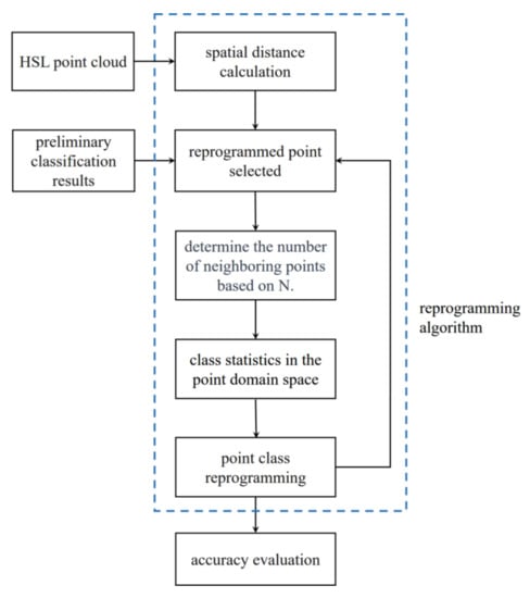 First, spatial distances of all points were calculated to generate an initial distance matrix, which, together with the preliminary classification results, was used as the input to the reprogramming algorithm. The initialized distance matrix S was calculated as Equation (2) by the Euclidean distance between point and point in the sample point cloud.
