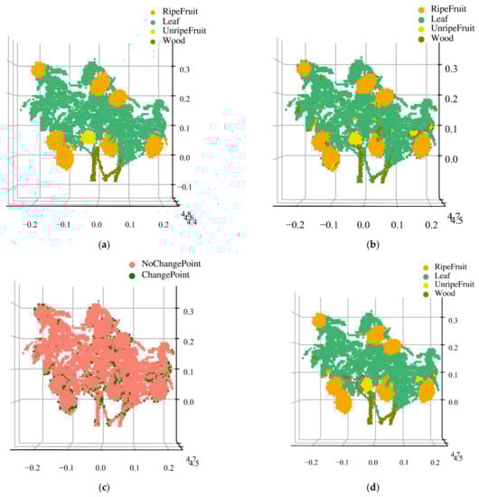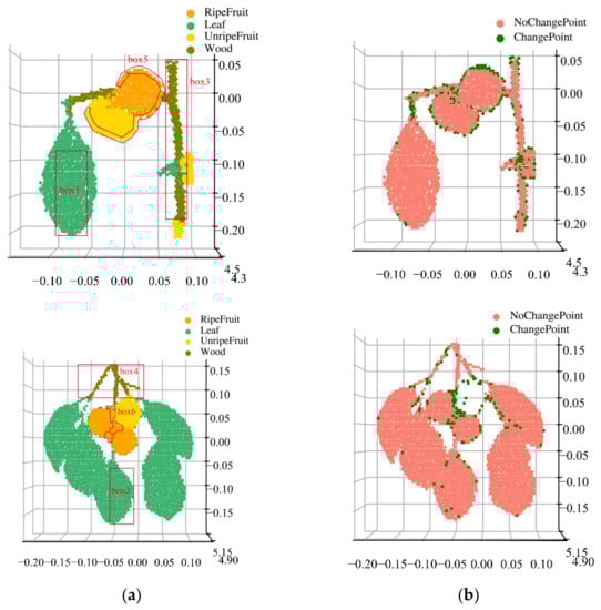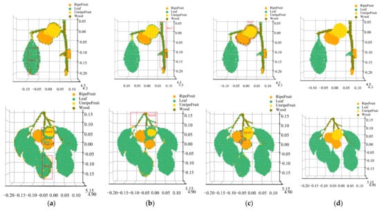 Figure 9a shows the classification result reconstruction of the two persimmon samples. Our method can effectively distinguish different tree components; in particular, the point class in the edge areas can still be corrected during preliminary misclassification. Compared to Figure 7, the leaf and wood classification results are ideal, as shown in red boxes 1, 2, 3, and 4, and most of the misclassified edge points of unripe and ripe fruit were corrected, as shown in red boxes 5 and 6.