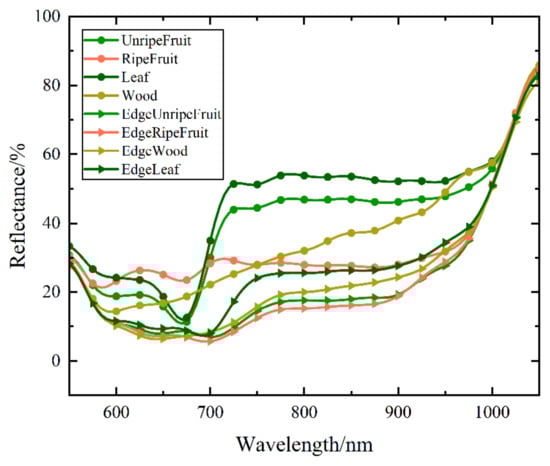 As shown in Figure 8, there are obvious reflectance differences between the edge and nonedge points. The nonedge reflectance of unripe fruit is 10.36% higher than its edge average, and there is a clear red-edge effect on the spectral reflectance of nonedge points, while the spectral reflectance of edge points shows a slowly increasing trend. The nonedge point reflectance of ripe fruit is 17.81% higher than that of the edge point on average, and the spectral reflectance is more flatly distributed in the range of 600 nm–900 nm, while the spectral reflectance at the edge shows a slowly increasing trend. The nonedge reflectance of the leaf and wood are, on average, 18.18% and 11.06% higher than their corresponding edge points, respectively, and their edge reflectance curves have a similar trend. The overall reflectance curve trends similarly at the edge of the four component classes, while the leaf edge spectral reflectance is higher. In summary, the spectral differences between the edge points and nonedge are the main reason for the misclassification of the edge points with reflectance as a feature for classification only.