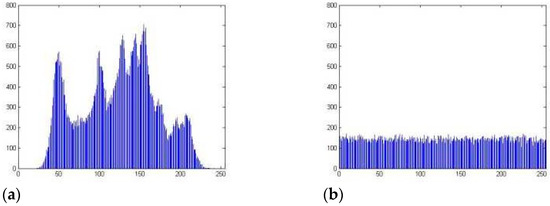 (a) Histogram of the plain image, (b) Histogram of cypher image.