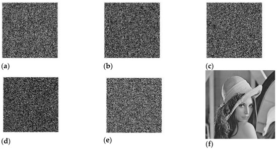 Encrypted image ‘Lena’ reconstructed using the wrong key (a) × 10 = 0.56 + 1.0000 × 10−14, (b) × 20 = 0.49 + 1.0000 × 10−14, (c) × 30 = 0.76 + 1.0000 × 10−14, (d) K1 = 115.7100 + 1.0000 × 10−14, (e) K2 = 395.0100 + 1.0000 × 10−13, (f) K3 = 203.4900 + 1.0000 × 10−13.