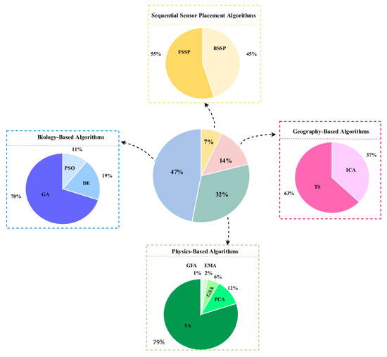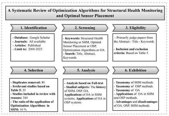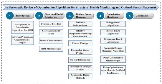 The present article systematically reviews the history of research on optimization algorithm development for SHM systems. The paper’s wealthy literature review investigates numerous approaches and their effectiveness. Moreover, readers are provided with the concept of optimization algorithms and their applications for OSP and SDD methods. Besides all this, as complementary tools, flowcharts, and tables are presented. These summarize the processes of the most important optimization algorithms used for SHM and provide an overview of recent related literature. A diagram of the manuscript’s structure summarizing the different sections of this work is displayed in Figure 3.