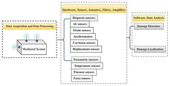 The two main components of an SHM system are hardware and software. The hardware comprises a dense network of sensors, actuators, filters, amplifiers, and cables. The software components include data processing modules. Figure 4 displays the main components of an SHM system. As a general guideline for developing a suitable SHM system, the following should be considered: