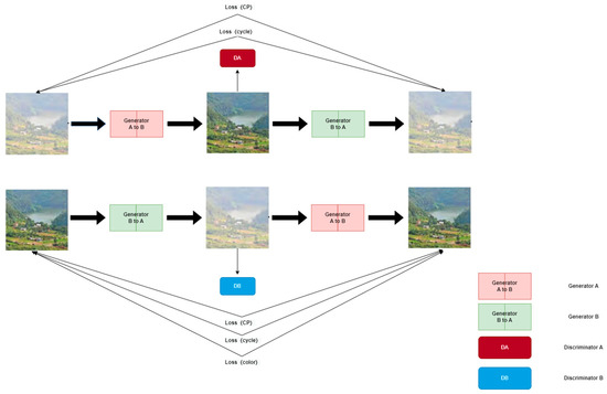 In Formula (9), is the cycle perception loss, is the color adjustment loss and is the weight factor. Cyclic perception loss can improve the semantic similarity between the generated image and the real image, while color adjustment loss can avoid serious differences between the generated image color and the original image color, and it can guide the generator to generate more realistic images.
