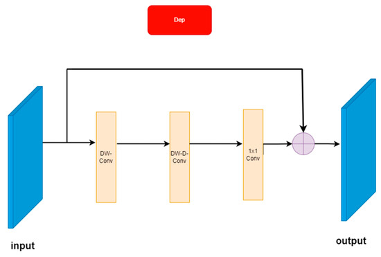 30] and the feature information is extracted by 5 × 5 channel-by-channel convolution (DW-Conv). Then, the target’s receptive field is expanded by 7 × 7 channel-by-channel void convolution (DW-D-Conv) to capture multi-scale context information at the same time. Finally, the output feature map is obtained by 1 × 1 point-by-point convolution. The Dep residual blocks in