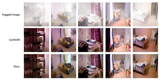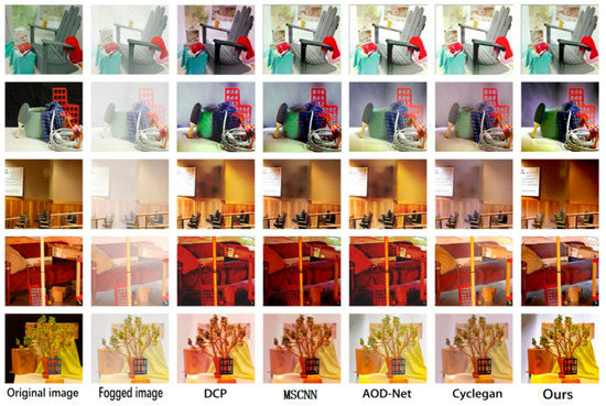 15]. Moreover, CycleGAN proposes an end-to-end dehazing model, which can learn the mapping relationship between foggy images and fog-free clear images, but it cannot guarantee that the foggy images are mapped to the desired high-quality clear images, and there is image blur after dehazing and information loss issues.