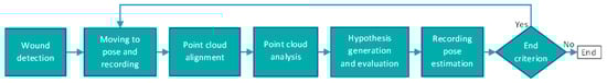 The second stage is to control the robot to the desired recording pose. During this stage, the PhoXi scanner acquires depth images and point clouds, while the RGB image acquired by the Kinova vision module is registered to the PhoXi depth image. In the case that the considered point cloud is the first in a series for the wound reconstruction process, an additional wound detection is executed in order to create a volume-of-interest bounding box, which is then used as the region to concentrate the efforts of the reconstruction process and the segmentation process in the later stages.