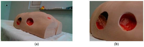 For the purposes of our research, a database of 145 images of two wound models (the Seymour II Wound Care Model and the Vinnie Venous Insufficiency Leg Model by VATA Inc.) was created. Thus, the classifier model obtained in this work is only suitable for images of synthetic wounds. The original images, of dimension 1280 × 780, were taken under uncontrolled illumination conditions, with various backgrounds. Sample images of the dataset are shown in Figure 3. The images were manually annotated per pixel into wound and non-wound. This dataset was further augmented (image flipping and rotation by 180°) and then divided into a training set with 504 images and a test set with 76 images.