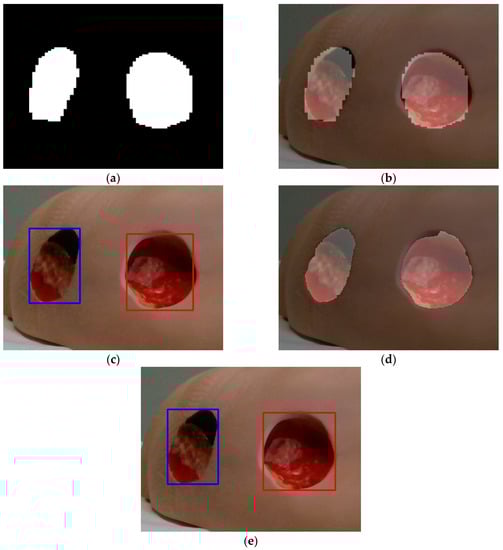 Enlarged section of the original test image under consideration: (a) output binary image obtained as a result of the method proposed by Wang et al. [10]; (b) wound pixels marked on the original image; (c) corresponding region of interests (ROIs) of image (b) where blue and red denotes different wounds; (d) wound pixels marked on the original image after additional post-processing using GrabCut; (e) corresponding ROIs of image (d) where blue and red denotes different wounds.