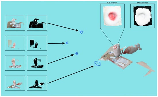 Figure 9 shows an example of optimized labeling where four recordings were used to reconstruct a wound. The figure shows a reconstructed 3D model, registered RGB, and mask images, as well as local point cloud wound area textured with color and an optimized mask projection.