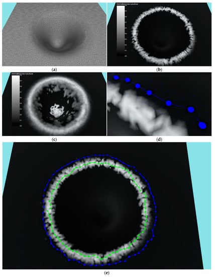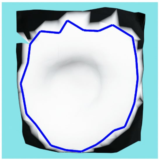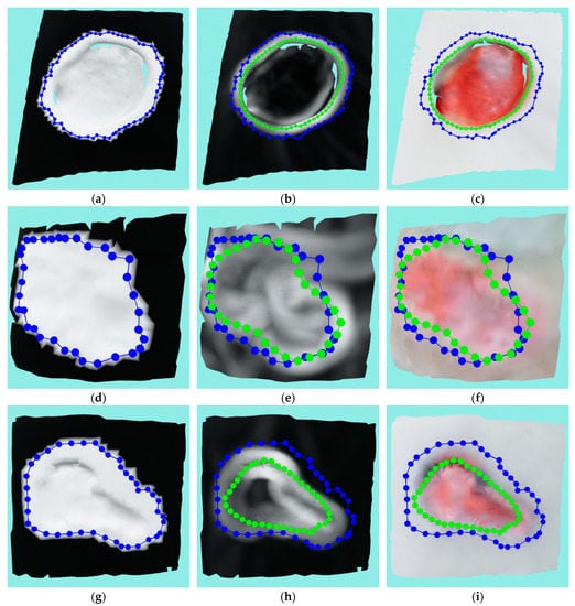 A more realistic example of the ACM application can be seen in Figure 14. Figure 14a–c shows a very successful application of the ACM where the first image shows the masked mesh and initial contour and the second and third images show the initial and final contour with a curvature texture and RGB texture, respectively. A successful run with some inconsistencies can be seen in Figure 14d–f, where the ACM managed, for the most part, to find the wound border with some small areas in the left and top still being over-segmented. The reason for the error on top of the wound was actually the close proximity of the second wound, not object of this analysis, on the same medical model that has more pronounced edges which then “stole” the contour from the observed wound. An unsuccessful run is shown in Figure 14g–i, where it can be seen that the ACM under-segmented the wound, with the final contour slipping to the bottom border of the wound surface instead of remaining on the top border. The error was caused by a relatively shallow wound with strong top and bottom borders. The ACM could not numerically distinguish between the top and bottom border since the bottom was very close due to the shallowness; it therefore “slipped” to the bottom, causing the wound to be under-segmented.
