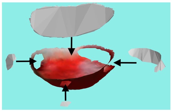 Generating the final wound boundary using the ACM algorithm is the starting point of calculating the physical properties of the wound, as the boundary directly enables the calculation of the wound perimeter and the area in the case of a shallow wound. For deep wounds, the area is considered to be the skin missing on the top of the wound, therefore a virtual skin top needs to be generated. Similar to our previous research [4], the top of the wound, as well as other holes in the 3D model, are closed using constrained 2D Delaunay triangulation implemented in the VTK library [32]. Even though this Delaunay implementation is for 2D point sets, 3D data can be used by projecting all of the points on a plane chosen as a most likelihood plane by calculating the PCA and choosing the eigenvector corresponding to the largest eigenvalue. Creating a virtual skin top facilitates wound area measurement while creating covers for all holes; it enables the creation of the watertight 3D model and calculating the volume. Figure 15 shows an example of the final wound surface cut from the input mesh by the contour generated from the ACM, along with the generated surfaces used for hole filling.