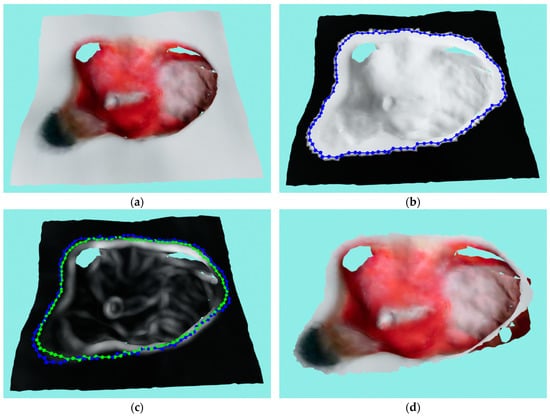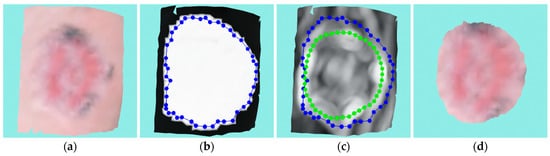 This wound is a neuropathic ulcer of comparatively smaller size compared with the previously considered wounds, but because of its depth, four recordings were needed to reconstruct it properly. Figure 19a shows the 3D reconstruction model of the local wound, while Figure 19b shows the optimized mask projection. It can be seen that the mask encompasses a large area around the actual wound. Figure 19c shows that despite this larger masked area, the ACM manages to precisely envelop the actual wound. The final segmented and cut wound is shown in Figure 19d.