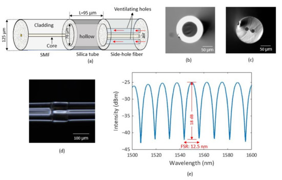 - Ferreira, M.S.; Coelho, L.; Schuster, K.; Kobelke, J.; Santos, J.L.; Frazão, O. Fabry–Perot cavity based on a diaphragm-free hollow-core silica tube. Opt. Lett. 2011, 36, 4029–4031. [Google Scholar] [CrossRef] [PubMed]