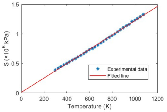 To validate our proposed temperature measurement method according to Equation (6), we calculated for different temperatures ranging from to . Figure 9 shows the linear relationship between the absolute temperature T (in K unit) and S (in kPa). The R-square of the linear fitting coefficient is found 0.9986. This shows that the sensor is linear up to a high temperature over at least . The good agreement is also an indication of the validity of the theoretical model. From Equation (6), the value of the gas (air) constant, is found K/kPa (or 0.00568 K/psi), which matches our previous work [32]. Therefore, this temperature measurement method requires no calibration even if the sensor’s cavity length is different.