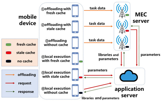 At timeslot t, the mobile device n with the generated DNN inference task can make an offloading decision to process the task. According to the service caching placement decision and service parameter freshness status, the cost of the mobile device can be divided into the following cases, as seen in Figure 1.