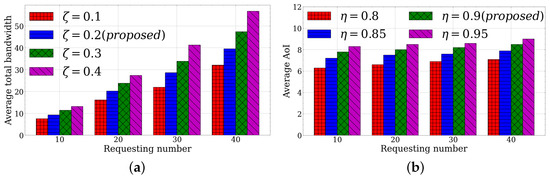 We first investigate the LLUC module to compare the performance of the time average–total bandwidth under different learning rates of the penalty weight. From Figure 2a, it can be shown that our proposed LLUC module with achieves the best result over the change of the requesting number. As increases from 0.1 to 0.4, the performance degrades over all of the requesting numbers. A lower learning rate results in a relatively high penalty weight and the Lyapunov optimization minimizes the penalty. In the meantime, selecting a lower learning rate may lead to a higher backlog and further delay the response fetching time. Therefore, it is advisable to make a moderate selection to balance the bandwidth consumption and time overhead. Since using only increases bandwidth by 24.0% and decreases the queue backlog by 53.3% compared to using for 10 requests, we take as the learning rate, considering the bandwidth and time.