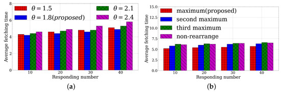 From the perspective of the module KCDF, we first evaluate the performance of the average fetching time under different link-initialized coefficients. Figure 3a plots that the KCDF with outperforms other link-initialized coefficients as the responding number increases. It is concluded that a lower link-initialized coefficient can remove more unsatisfied links in the KM algorithms. As increases from 1.8 to 2.4, the average fetching time becomes higher. However, selecting a link-initialized coefficient that is too low such as can increase the probability that the MEC server or mobile device fails to find a link in the equalling matching subgraph, which can significantly decline the performance. To make a feasible balance trade-off, we select to guarantee the transmission time latency with at least a 2.3% performance improvement over the second-best result from in 10 responses.
