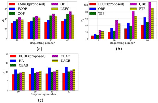 From Figure 4a, we investigate the average cost of the distinct baselines of the LMKO modules. Our LMKO module achieves the minimum of under different requesting numbers. The LMKO module is capable of obtaining the minimum cost by offloading the task to the best MEC server or local execution. The second-best result belongs to the FCOP algorithm since the mobile device chooses a MEC server with a fresh cache to offload. The performances of the COP and OP are poor owing to their extra service fetching times. The worst result is brought by the LEFC since it does not take advantage of offloading in the edge system. The LMKO module is efficient in terms of the cost of the time delay and energy consumption with at least a 4.1% performance gain compared to the second-best result from FCOP (for under 10 requests).