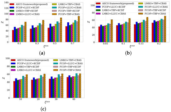 Figure 5b shows the performance of the average energy cost of the combinations. Our ASCO framework keeps the best result while the energy weight varies and the weights of the time and bandwidth are fixed. The LMKO module makes an economized energy offloading decision to save the energy consumption of mobile devices. At the same time, other baseline combinations with the LMKO module outperform other combinations without the LMKO module due to the consideration of energy in the LMKO module. LMKO+TBP+KCDF, LMKO+LLUC+CBAS, and LMKO+TBP+CBAS obtain middle performances due to the lack of energy concerns. FCOP+LLUC+KCDF, FCOP+LLUC+CBAS, and FCOP+TBP+KCDF have higher costs since their modules are not efficient in terms of costs. Similarly, FCOP+TBP+CBAS had the worst performance. Hence, the average energy result verifies that our proposed framework achieves superior performance with respect to energy consumption with at least a 2.8% improvement compared to the second-best result from LMKO+TBP+KCDF under .