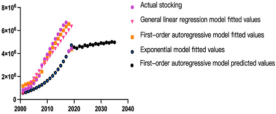 Table 4, the average relative error of values predicted by the first-order autoregressive model is lower than the average relative error of values predicted by the generalized linear and index models. Therefore, the first-order autoregressive model predicts the number of large- and medium-sized tractors in China more accurately than the generalized linear and index models. The equation for the first-order autoregressive model is as follows:
