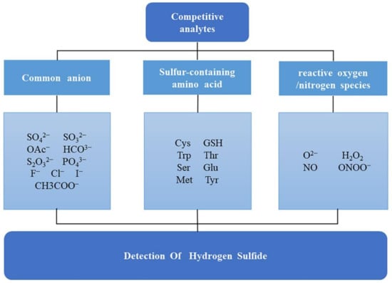 Hydrogen sulfide (H2S), often regarded as an environmental pollutant, is a colorless, flammable, and toxic gas with a distinct rotten egg smell [1]. In recent years, extensive studies have revealed that H2S is the third gasotransmitter following nitric oxide (NO) and carbon monoxide (CO) [2,3]. H2S is endogenously generated by three principal enzymes: cystathionine-β-synthase (CBS), cystathionine-γ-lyase (CSE), and 3-mercaptopyruvate sulfurtransferase (MST) [4]. Because of its various functions in physiological and pathological processes, H2S detection has become a research hotspot in the field of biology [5]. Currently, H2S is utilized in immune response, signal transduction, and energy production. Endogenous H2S mediates a wide range of physiological functions in the cardiovascular, neuronal, immune, endocrine, and gastrointestinal systems [6] in the aspects of the regulation of blood pressure, neurotransmission, anti-inflammatory effects, vasodilation, antioxidation, and apoptosis [7]. For example, the physiological concentration of H2S in blood lies in the range of 10–100 μM, and a close correlation exists between H2S levels in serum and disease states [8]. Additionally, changes in levels of H2S in the body have been linked to a variety of diseases, such as Alzheimer’s disease, Down syndrome, diabetes, cirrhosis of the liver, and even cancer [9]. Recent studies have unveiled that H2S levels are also closely related to asthma and chronic obstructive pulmonary disease (COPD) [10]. Due to the complex environment of organisms, the detection of H2S may be affected by other competitive analytes [11]; common competitive analytes in organisms and living cells are shown in Figure 1. In order to screen and monitor H2S levels in organisms and living cells and prevent health effects, a reliable, sensitive, and highly selective analytical technique is urgently needed.