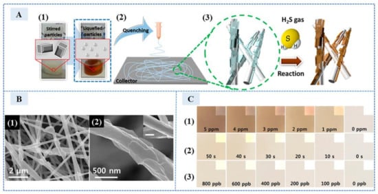 In addition to producing copper sulfide precipitates, silver sulfide (black) and lead sulfide (brown) have obvious color changes; it is also one of the options for detecting H2S. In 2018, Zhao et al. [22] developed a highly selective and sensitive electrochemical sensor based on Au@Ag core-shell nanoparticles (Au@Ag NPs). The electrical activity of Au@Ag NPs provided good electrical conductivity and promoted the formation of Ag2S, resulting in the decrease of differential pulse voltammetry (DPV) peak at 0.26 V. In the range of 0.1 nM to 500 nM, the logarithm of H2S concentration was linear with the DPV peak at 0.26 V. In 2019, Jornet-Martínez et al. [23] proposed a method to detect H2S by supporting silver nanoparticles (AgNPs) on nylon, which can exhibit good color intensity due to the higher retention rate of the nylon carrier. The formation of Ag2S led to further aggregation of monodisperse silver nanoparticles. The absorbance ratio at 550 nm and 415 nm exhibited a linear relationship with the logarithm of H2S at 150–1000 ppbv, and the detection limit was 45 ppb. This sensor can detect H2S at the ppb level, which had a low detection limit. In 2018, Cha et al. [24] made colorimetric chemical sensors using porous Pb(Ac)2 anchored nanofibers (NFs). The schematic diagram of sensor preparation and detection is shown in 1–3 of Figure 3A. It used electrospinning technology to provide a large number of reaction sites for detection. The scanning electron microscope (SEM) image of HTS-Pb(Ac)2@NFs synthesized by electrospinning technology is shown in 1 and 2 of Figure 3B. The formation of PbS changed the color, and the color changed under different H2S concentrations; exposure times are shown in 1–3 of Figure 3C. H2S as low as 400 ppb was detected at a relative humidity of 90%. It was also used to detect H2S in breath samples of patients with bad breath.