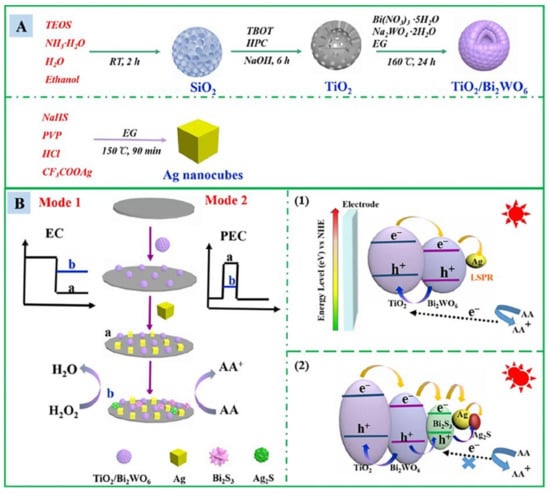 (A) Preparation process of TiO2/Bi2WO6 and Ag nanocubes; (B) Schematic illustration of the fabrication of dual-mode sensor for the H2S detection, and the proposed photocurrent signal on–off sensing mechanism based on the TiO2/Bi2WO6/Ag in the absence (1) and presence (2) of H2S. (Reprinted with permission from Ref. [31]. 2021, Xu et al.).
