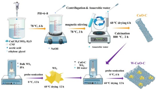 Mulit-component composite materials can also help improve the sensitivity of sensors due to their excellent properties. In 2022, Li et al. [34] used cellulose nanofiber (CNF)-templated CuO (CuO-C), which was decorated with tungsten disulfide (WS2) nanosheets (W-Cu-C) as the sensing layer of electrochemical sensor for H2S recognition. A schematic diagram of the material preparation procedure is shown in Figure 5. The combination of metal oxide CuO and transition metal dihalide WS2 can significantly sensitize the gas sensor, thus improving the sensitivity of the sensor. On the one hand, CNFs were adopted as the nucleation template of the CuO material to boost the utilization efficiency of the sensing component when interacting with H2S molecules simultaneously augmenting the conducting pathways after its calcination into carbon nanofibers. On the other hand, layered WS2 nanosheets acted as dual roles of sorption-sites supplier and heterojunction ingredients, jointly amplifying the sensing signal. This sensor had a low detection limit of 200 ppb and an ultra-low power consumption of 8 mW, which provided a good choice for wearable devices.