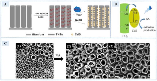 In order to solve the problem of biocompatibility and toxicity, it can be solved from two aspects. The first is composites engineering with secondary substances of good biocompatibility and low toxicity. In 2016, Ding et al. [36] developed an electrochemical sensor based on TiO2 to detect endogenous H2S production in stimulating MCF-7 cells with VEGF. The synthesis and detection process of the sensor is shown in the Figure 6A. The surface of TiO2 nanotubes was modified by a layer of thioglycolic acid (TGA) to introduce thiol groups which can adsorb and immobilize Cd ions. Because of the good biocompatibility, TiO2 greatly improves the cell activity when detecting exogenous H2S released by cancer cells. However, the large band gap (3.0–3.2 eV) of TiO2 limits its adsorption mainly in UV range. Figure 6B clearly elucidates the injection of excited electrons from CdS to TiO2. When CdS is generated, it also acts as a visible light sensitizer due to its narrow band gap (2.4 eV), which improves the sensitivity. The SEM images, TiO2 nanotubes, and those treated after with different concentrations of H2S, are shown in 1–3 of Figure 6C.
