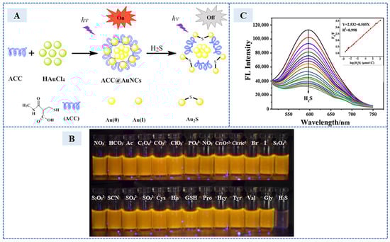 (A) The detection process of the fluorescent sensor. (B) Photographs of ACC@AuNCs with different analytes solution viewed under UV light at 365 nm. (C) Fluorescence responses of the sensors after the addition of H2S (from top to bottom: 0.002–120 μmol L−1). Inset: plot of the fluorescence peak intensity change (F0/F) versus the logarithmic of the concentration of H2S. (Reprinted with permission from Ref. [39]. 2017, Zhang et al.).