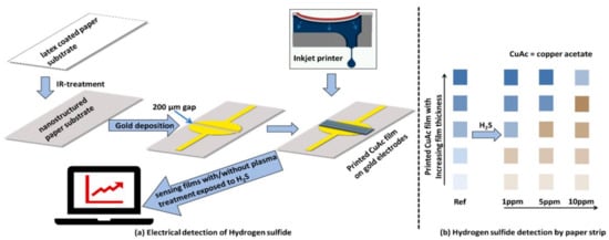 Schematic illustration of the development of gas sensing film on nano-structured paper substrate for electrical detection (a) and on specialty-paper substrate for colorimetric detection (b). (Reprinted with permission from Ref. [42]. 2019, Sarfraz et al.).