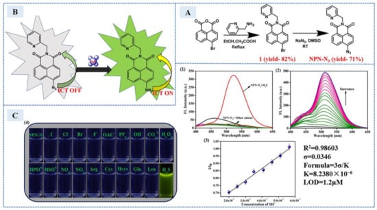 In 2022, Jothi et al. [58] used 6-azido-2-(pyridin-2-ylmethyl)-1h-Benzo[de]isoquinoline-1,3(2H)-Dione (NPN-N3) for fluorescence detection of H2S in Escherichia coli cells. A and B in Figure 9, respectively, show the synthesis of NPN-N3 and the emission response mechanism of NPN-N3 to H2S. The azide group of nonfluorescent napthalimide was reduced to amino group under the action of H2S, and the green fluorescence was produced. In Figure 9C, 1–3 shows the change of fluorescence spectrum and the linear relationship after the addition of H2S or different anions, and 4 shows the change of solution color. In addition, the absorbance of the sensor probe decreased at 365 nm and redshifted to 416 nm after H2S exposure, accompanied with naked eye-visible color change from colorless to yellow. This phenomenon indicated that the probe could also be used as a colorimetric sensor.