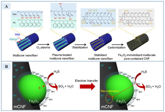 (A) A sequential composite diagram of Fe2O3 immobilized multiscale pore contained carbon nanofiber (Fe2O3-MPCNF). (B) Description of sensing and recovery mechanisms due to chemical reaction of H2S molecules and Fe2O3-MPCNF. (Reprinted with permission from Ref. [60]. 2022, Kim et al.).