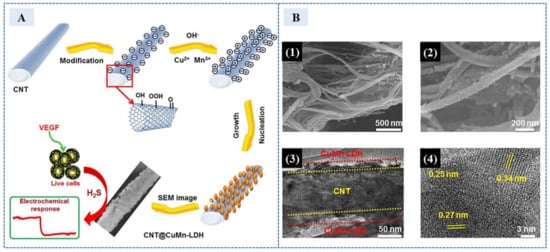 In 2019, Asif et al. [69] designed an extremely sensitive electrochemical sensor with a 2D nanosheet-shaped layered double hydroxide (LDH) wrapped carbon nanotubes (CNTs) nanohybrid (CNTs@LDH), where a series of CNTs@CuMn-LDH nanohybrids with varied amounts of LDH nanosheets grafted on a conductive CNTs backbone had been synthesized via a facile coprecipitation approach. The material synthesis and testing process is shown in the Figure 11A. Nanomaterial non-enzyme electrochemical sensors show excellent performance in sensitivity and anti-interference ability. CNTs@CuMn-LDH had superior surface area (different electron microscope images are shown in 1–4 of Figure 11B), providing more binding active sites for H2S. Meanwhile, the high conductivity of carbon nanotubes improved the efficiency of the oxidation of H2S into S, further greatly improving the sensitivity. This sensor can detect at low potential, reduce the interference of electroactive substances in the organism to detect, and was applied to the H2S secreted by human cells stimulated by VEGF. The linear range was 8 nM–2.9 mM, the detection limit was 0.3 nM. It had wide detection range and low detection limit.