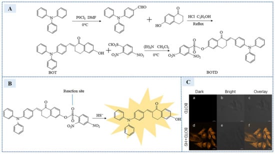 (A) Synthesis route of BOTD. (B) Schematic illustration of BOTD’s sensing towards HS− cations. (C) Fluorescence images of HeLa cells (λex = 420 nm, λem = 500–550 nm): (left) dark field; (middle) bright field; and (right) overlay image. (a–c) Images of HeLa cells incubated with BOTD (10 μM/L) for 30 min; (d–f) fluorescence images of cells pre-treated with NaHS (100 μM/L) for 1 h and then incubated with BOTD (10 μM/L) for 30 min. (Reprinted with permission from Ref. [85]. 2020, Wang et al.).