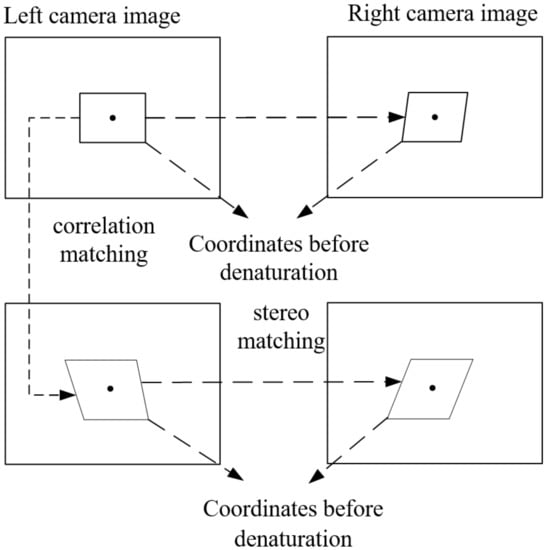 There are two main matching strategies for 3D-DIC [20,21]: one is stereo matching of images taken by left and right cameras at the same time; the other is the deformation matching (correlation matching) of images before and after deformation taken by a single camera. In the first step, the corresponding points of the same object that point to the left and right images at a certain time can be found to reconstruct the 3D morphology of the object. The second step can track the position change of an object point in a single camera image during the deformation of the object under test. Combined with stereo matching and correlation matching, it can be used to solve 3D deformation parameters. In the 3D digital image correlation method in this study, the main image-matching method is gray matching method, which does not involve feature matching.