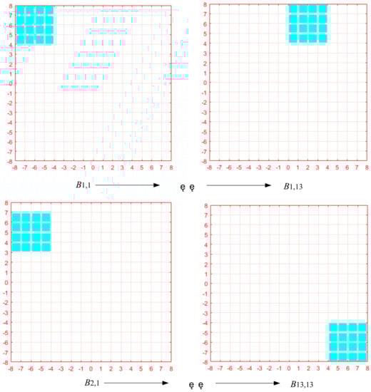 The exhaustive search method is one of the most simple and accurate search methods, that is, a full search, which can ensure that the region with the highest global relevance is matched. The exhaustive search used in this paper includes search range and search path. Firstly, subregions are divided in the reference image, and then the search range of subregions is set. After the search range is set, the subregions are searched and matched point by point in the set range, and the matching criterion is ZNCC or ZNSSD. As shown in Figure 1, for example, the subregion is set as 4, and the search range is set as [−8, +8]. The subregion searches B13,13 from B1,1, along the path as shown in the Figure 2. The position of the most correlated subregion of ZNCC or ZNSSD is taken as the displacement calculation point, and its position and deformation are taken as the initial iteration value of the reference subregion. The advantage of this method is that it can accurately locate the real initial value of iteration by exhaustive search, and the matching operation process of each reference subregion is independent and does not depend on the matching results of other reference subregions. Therefore, in full field matching, all reference subregion operations can be executed in parallel, which is very convenient for parallel programming.