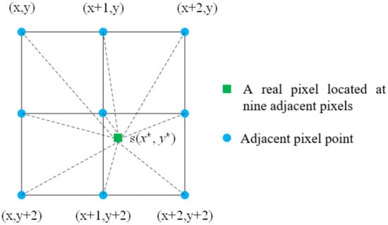It can be seen from the above equation that the first and second derivatives of the correlation coefficient s are the key to the problem. Generally, (x*, y*) is not an integer, and the gray value of (x*, y*) is obtained by gray interpolation of integer pixels. The diagram of first-order nine-point interpolation used in this paper is as follows (Figure 3).