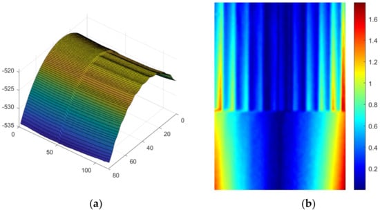 The obtained 3D reconstruction results are shown in Figure 5a. From the 3D surface reconstruction results, it can be seen that the characteristic shapes of each part of the measured object are correctly displayed, which verifies that the proposed algorithm can better achieve the 3D surface reconstruction of the measured object. A precision three-dimensional displacement table was used to rotate the measured object at a certain Angle. Figure 5b shows the displacement vectors in the three directions of X, Y, and Z after rotation. It can be seen from the displacement cloud diagram that the displacement conforms to the characteristics of rotation, that is, the displacement value near the center is small, and the displacement value at the left and right ends is large.