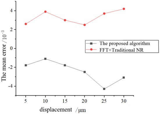 In order to quantitatively verify the accuracy information of the proposed algorithm, a precision 3D displacement stage is used to translate 5 μm, 10 μm, …, 30 um along the X-axis, and the mean error was calculated using the proposed algorithm and FFT+ traditional NR algorithm, respectively. The results are shown in Figure 6. It can be seen that the sub-pixel displacement solution accuracy of the proposed algorithm is significantly higher than that of the FFT+ traditional NR algorithm. When the displacement is 25 μm, the mean error of the proposed method is 0.008 pixels higher than that of the FFT+ traditional NR algorithm.