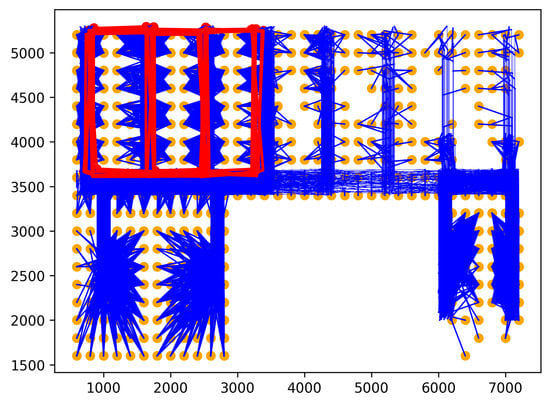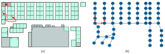 In the present work, depending on the floor plans of indoor spaces in datasets, each vertex represents a particular space. For example, in the MIT Badge dataset, a navigation graph is constructed as shown in Figure 3. In this floor plan, the space is divided into small working cubicles for workers. Therefore, each vertex is considered to cover two opposite cubicles and the part of the corridor between these cubicles. Moreover, since the movement characteristics are important for anomaly detection in human movement, vertices are positioned along the corridors. In Figure 3a, vertex 10 covers a space, represented by a small rectangle in the upper left corner of the floor plan. The graph vertices are connected based on the walking routes in the indoor area. To measure the indoor walking distance between the two positions in the floor plan, two vertices in the navigation graph that are the closest to the two positions in the floor plan are determined. The shortest path between the two vertices is defined as the indoor walking distance using the Dijkstra shortest path algorithm [38]. For example, in Figure 3, vertices 12 and 18 are the closest to the A and B points, respectively. Therefore, the distance between points A and B is the shortest path from vertex 12 to 18. This path is marked with red arrows as shown in Figure 3b.