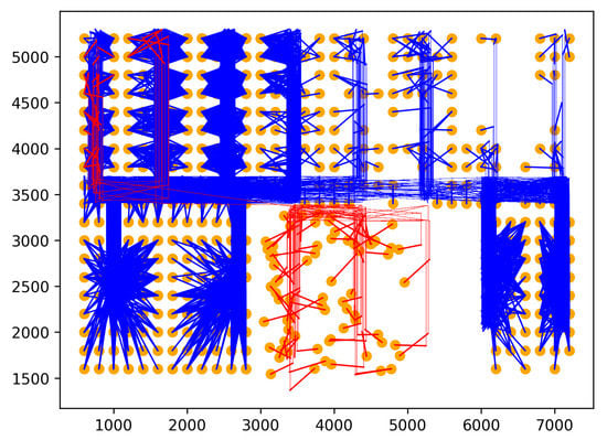 - Rare location visit anomaly. In indoor spaces, the rare location refers to where humans have rarely visited or been prohibited from visiting. For example, in a factory, the prohibited places may be security control and engine rooms that workers can not enter. Moreover, the rare locations can also be places that workers visit only at a specific time. For example, the cafeteria can be a rare location with workers during working hours, even though they may come there for lunch. Similarly, customers in supermarkets or stores are also not permitted to access some locations, including security, staff areas, and warehouses. Therefore, if one person moves to rare locations, his/her behavior may be anomalous. Rare locations need to be identified based on the floor plan and historical trajectories of the dataset to generate this anomaly. First, the floor plan is divided into grid cells. Then, the probability of each trajectory visiting cells is calculated using the history trajectories. The cells with visiting probability are 0 chosen as rare locations. Rare location visit anomalies are generated from the normal trajectories by shifting some points of original trajectories to the rare locations. The number of shifted points is controlled by the parameter . For example, means of the normal trajectory is moved to rare locations. The starting point for shifting is randomly chosen from the original trajectory. As shown in Figure 5, the red trajectory is a generated anomaly, while the blue trajectories are normal.
