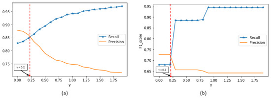 - Choosing parameter. The value of is selected based on the trade-off between the algorithm’s recall and precision. In this work, corresponds to the intersection point of recall and precision. This means that the algorithm needs to ensure anomaly detection ability while maintaining precision. Figure 8a,b show the performance of the algorithm when detecting noise for the MIT Badge and the sCREEN datasets, respectively. The value of , which equals 0.2 for both datasets, is determined from these figures.