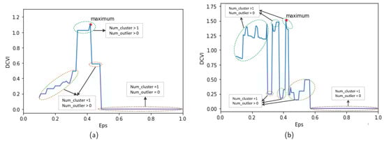 Figure 4 presents a way to determine the Eps value based on DCVI. First, the Eps value is changed from the minimum value to the maximum value of the trajectory distance. According to each Eps value, clusters of the dataset are found using DBSCAN. Then, the value of DCVI is calculated at this Eps value. Finally, the Eps value is chosen according to the maximum value of DCVI.