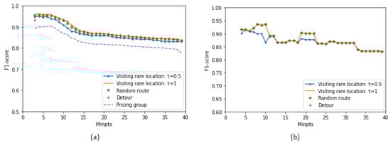 This subsection presents the performance of the proposed method over various anomaly types when varying the MinPts parameter of DBSCAN. It is known that MinPts has less influence than Eps on the clustering quality of DBSCAN. The value of MinPts often is chosen based on the user’s knowledge about datasets [45] (i.e., MinPts can be set to twice the dimensions of the data). In this experiment, the MinPts change in the range of . With a given value of MinPts, an appropriate value of Eps is determined using the DCVI metric. Then, the chosen Eps value is used for clustering trajectories and detecting anomalies. Figure 10a,b show the results in terms of the F1-score for the MIT Badge and sCREEN datasets, respectively. Note that only the LCSS_IS measure is used in this experiment. The trend of changing performance is similar to all anomaly types. The proposed method achieves the best results around MinPts = 8 on the two datasets. When , the performance of the proposed method is decreased. This may be explained by the fact that many trajectories are detected as noise when the MinPts that are chosen are too large, which may affect the clustering quality of DBSCAN. Therefore, the effectiveness of detecting anomalies is degraded.